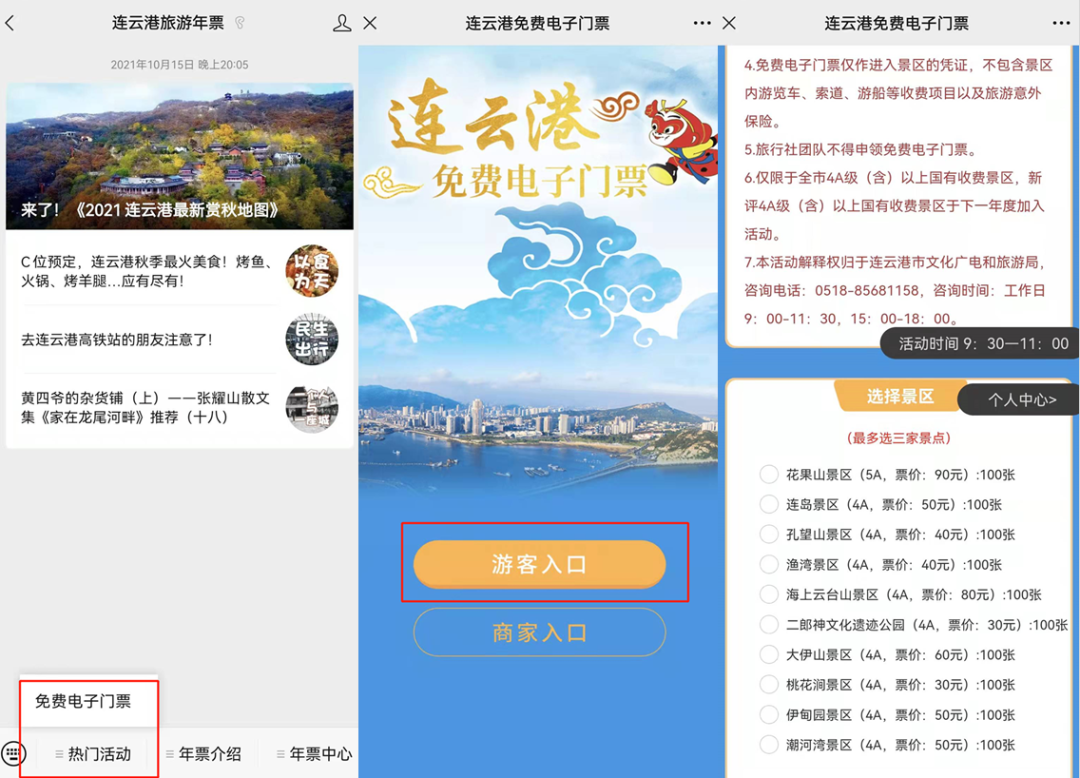 游客凭本人身份证号码在“连云港市文化广电和旅游局”或“连云港旅游年票”官方微信公众号免费申领。